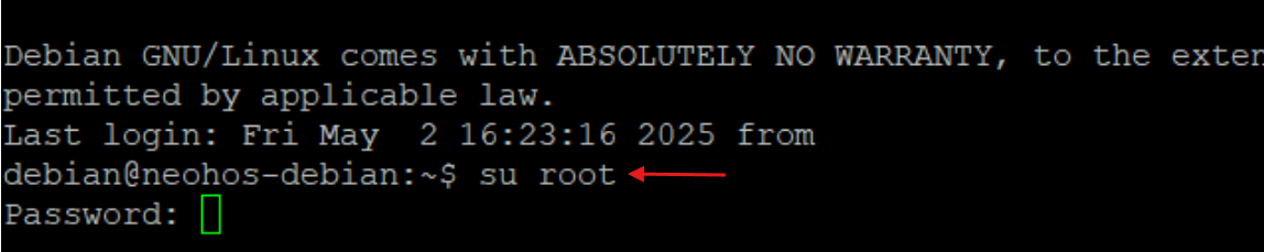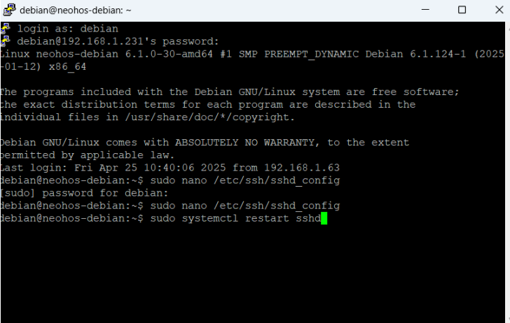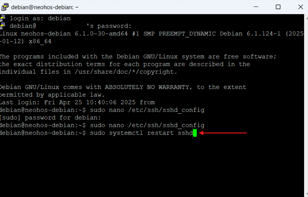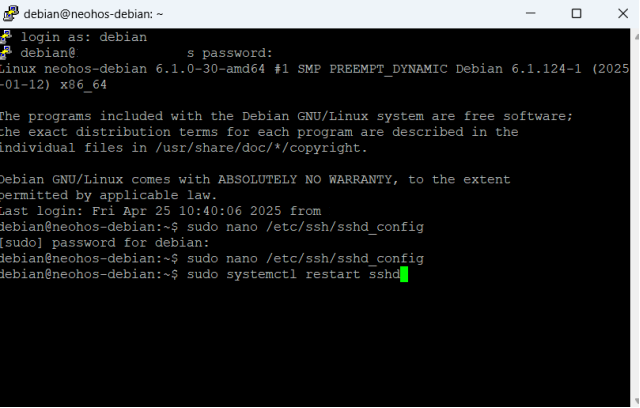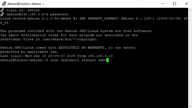 * debian\@neohos-debian: -s ใส่คำสั่ง <mark style="color:green;">**sudo systemctl restart sshd**</mark> แล้วกด **Enter**