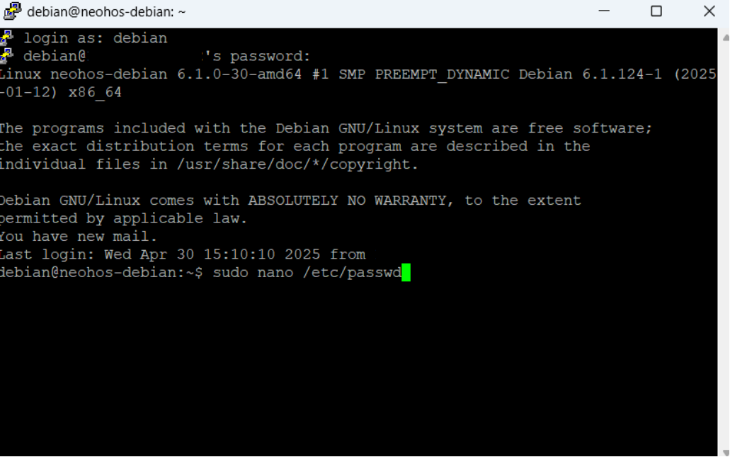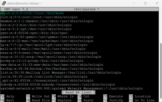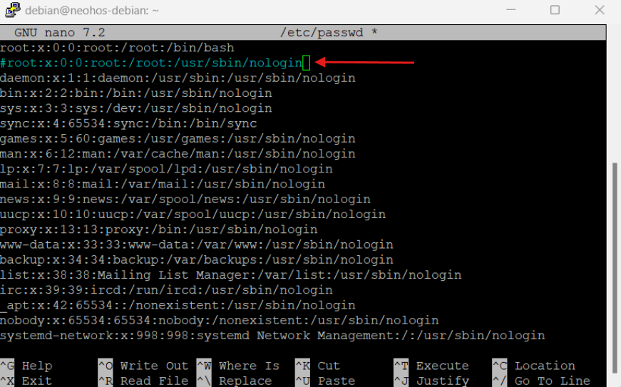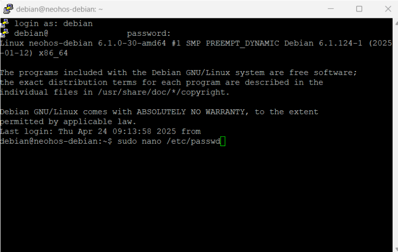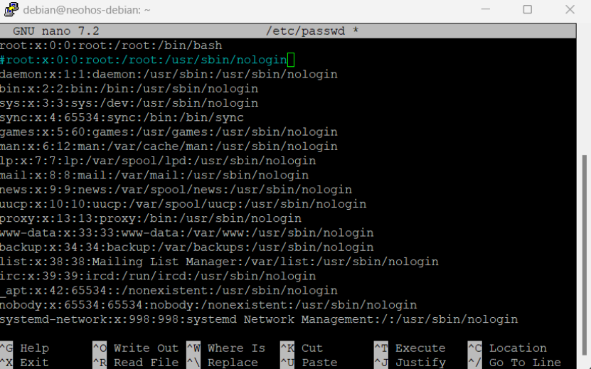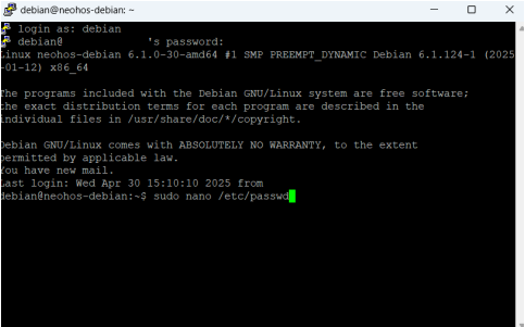 * debian\@neohos-debian: -s ใส่คำสั่ง <mark style="color:green;">**sudo nano /etc/passwd**</mark> แล้วกด **Enter**