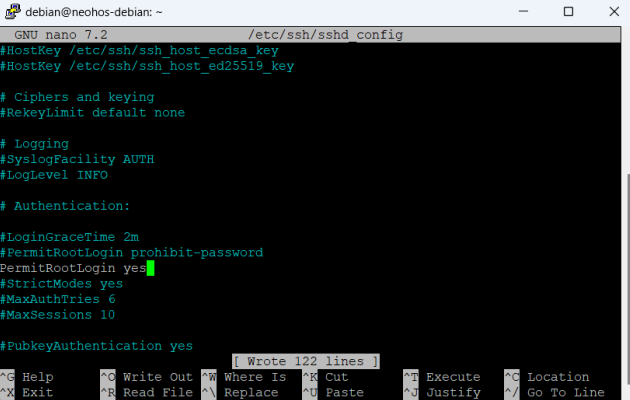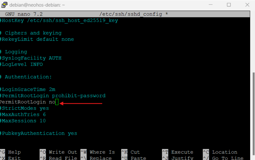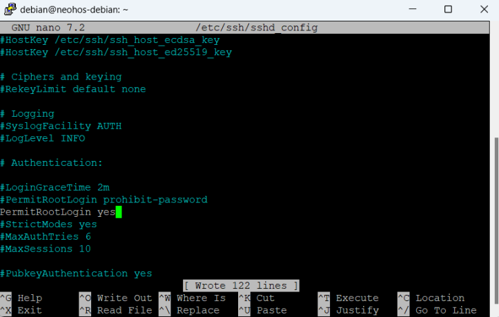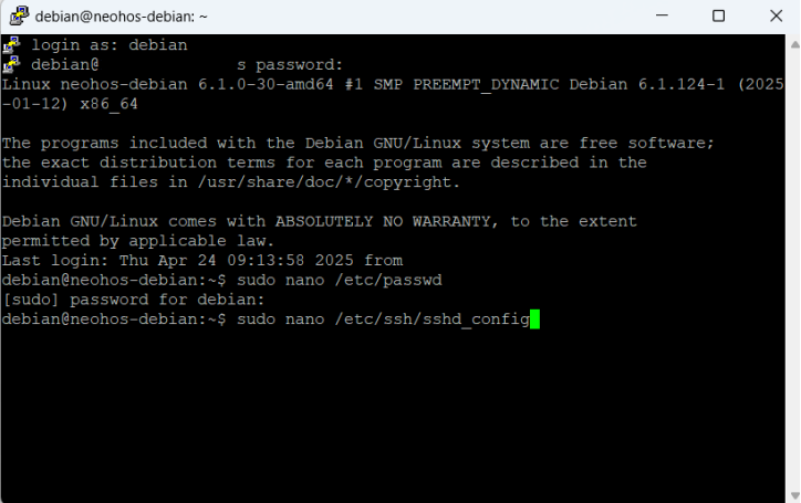 * debian\@neohos-debian: -s ใส่คำสั่ง <mark style="color:green;">**sudo nano /etc/ssh/sshd\_config**</mark> แล้วกด **Enter**
